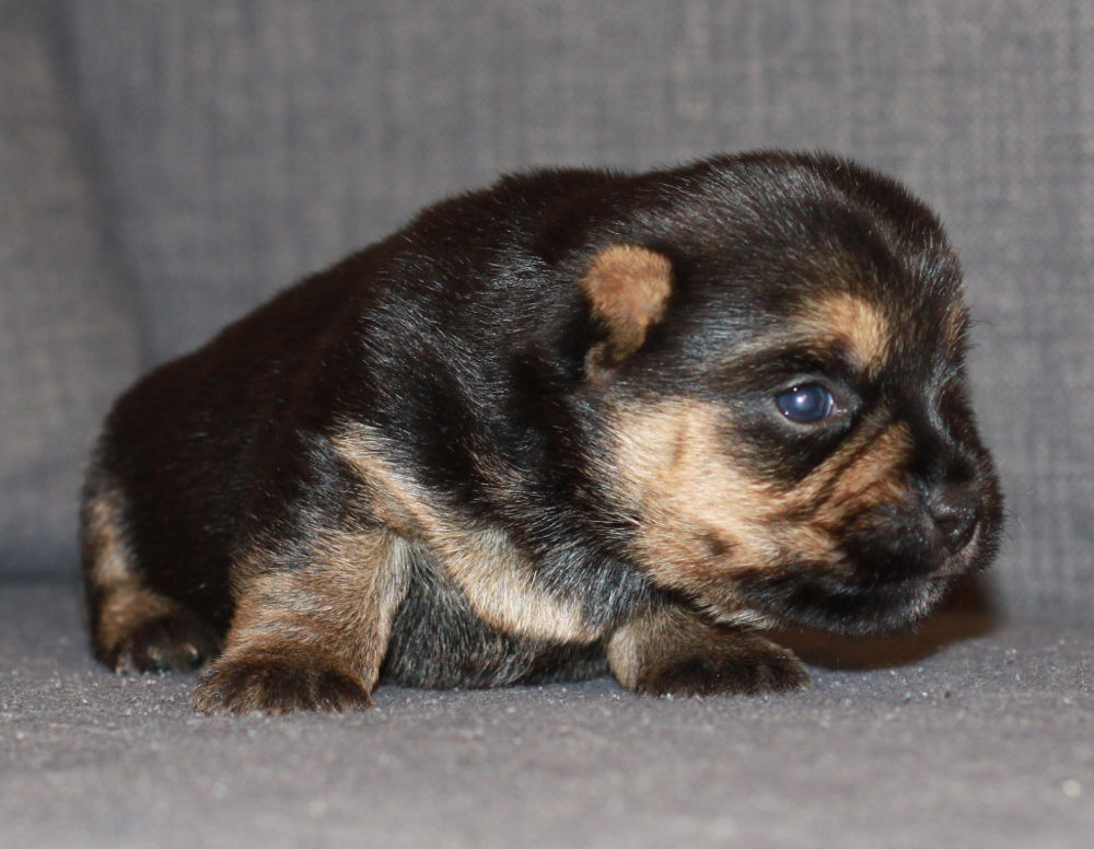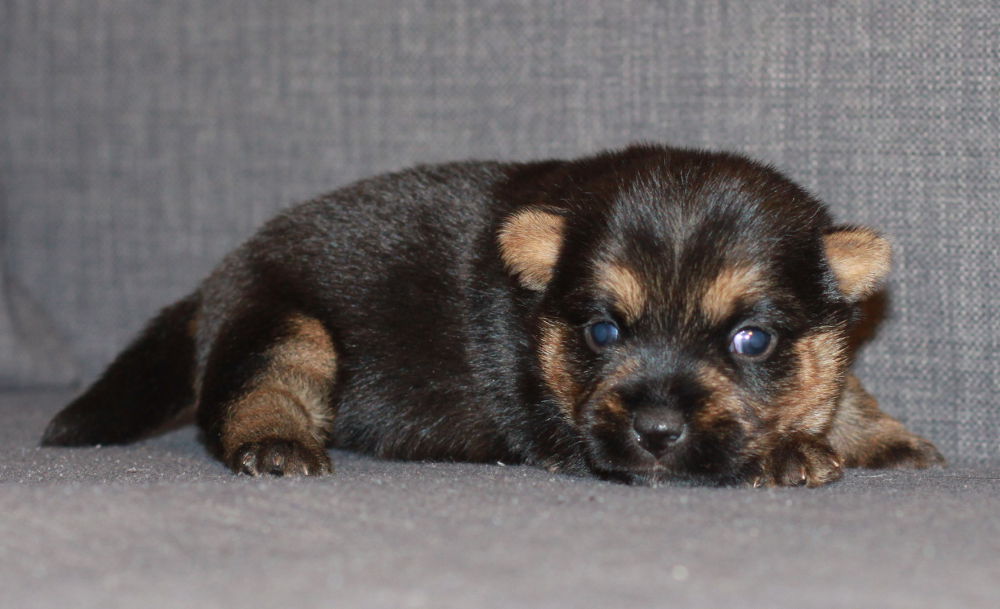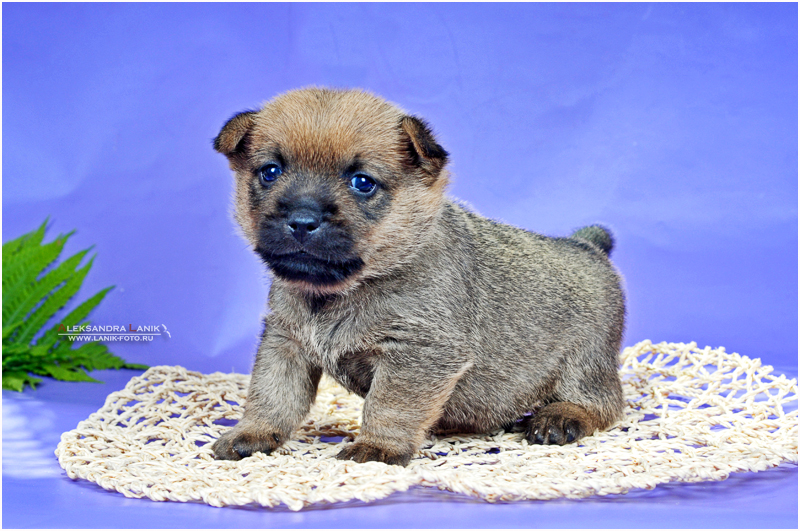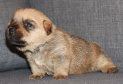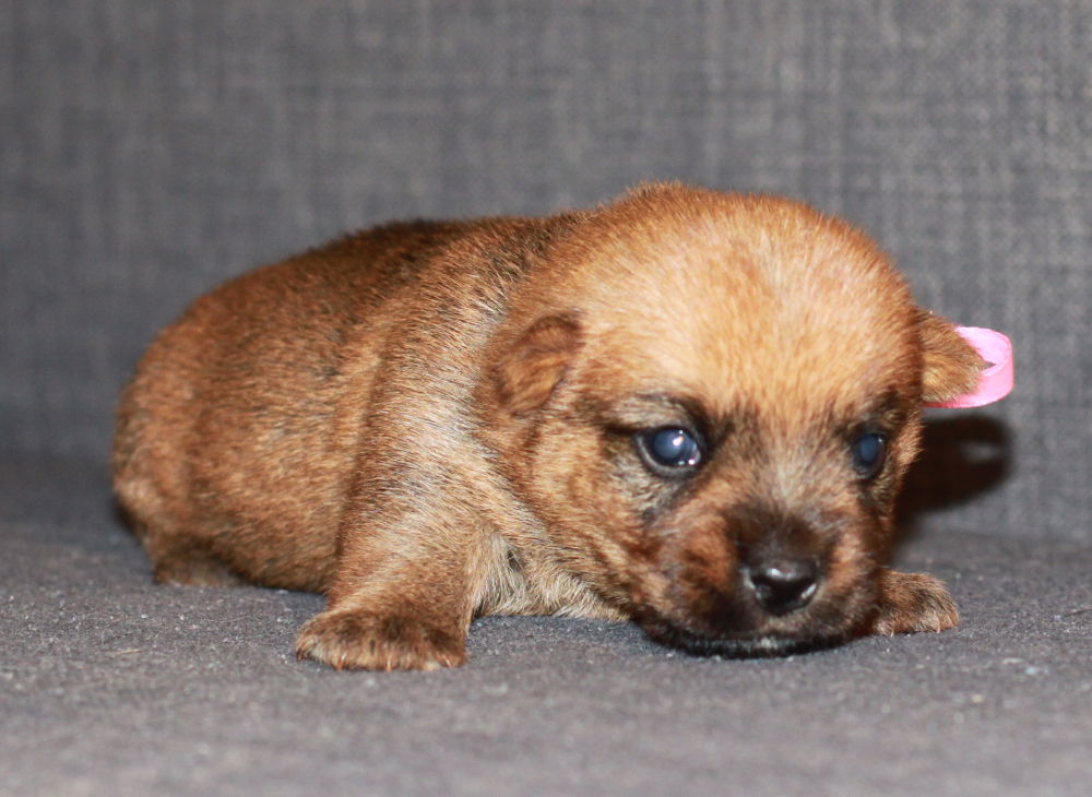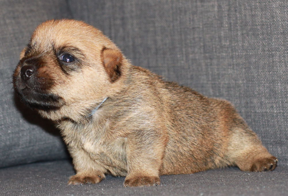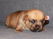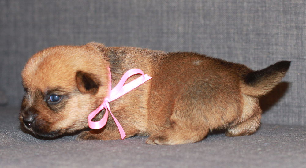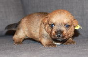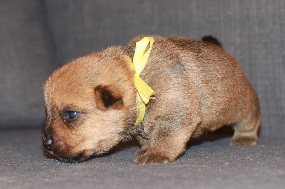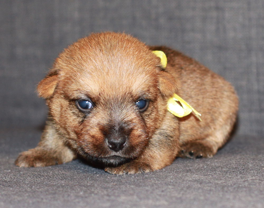 Щенки Норвич терьера, рожденные 19 сентября 2014 года: три мальчика и девочка рыжего окраса и девочка - чепрачного.